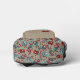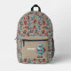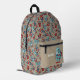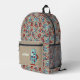 The front pocket of this backpack is ready to be personalised with a name or initials. It features a cute illustration of a retro robot in light blue against a tan background. The rest of the backpack has a pattern of robots in red and blue along with coordinating hex nuts against a tan coloured background.