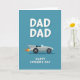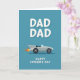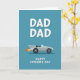 This design shows a deep teal background with the word “DAD” repeated twice across the top in large white sans‑serif letters, each one edged with a soft shadow for gentle depth 👨. In the center, a sleek silver convertible roadster sits like a proud centerpiece, its smooth curves and classic shape giving it a confident, caring presence 🚗. The rear fins sweep upward in a rocket-like style, adding a fun sense of motion as if it’s ready to take someone special on a quick getaway. From the exhaust, a burst of orange and yellow flames streams outward, bringing warmth and excitement that feels like an affectionate nudge to keep going. The wheels are simplified in dark gray with small white accents, keeping the focus on the car’s shiny body and the lively flame trail. Along the bottom edge, “HAPPY FATHER’S DAY” appears in the same white font, centered and easy to read against the teal. The layout feels balanced and friendly, with the big top lettering framing the car like a supportive cheer. The silver car’s tail flames fade from bright yellow to deep orange just above the lower text.