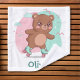 This personalised kids' wash cloth features a chubby baby bear gliding joyfully on tiny retro roller skates, leaving behind a sparkly, magical trail. This playful design is infused with a nostalgic 80s/90s aesthetic and has a soft neon pink and mint green background.