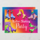 Brightly coloured retro roller skating birthday party invitation with a bold rainbow coloured background and multi-coloured skates and tights on the front with the cool saying "Let the good times roll" and a birthday template on the back which can easily be personalised.
