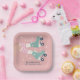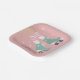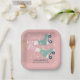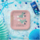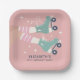 Cute blush pink roller skating birthday party paper plates with a retro-inspired illustration of teal blue roller skates on a girl wearing pink-striped tube socks and "Let's Roll" in a fun 70's style script.