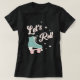 Cute roller skating birthday party t-shirt featuring "Let's Roll" in a fun 70's style script and a retro-inspired illustration of a teal blue and blush pink roller skate.