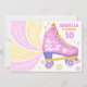 A fun and bright retro inspired roller skate design in the colour palette pastel pink, orange, purple and yellow. On the front is a pink roller skate with the text 'Let's Roll' in a retro script with a speed burst behind it, and on the back is a fun bright pattern of roller skates. Customise the details for your party! See the whole matching party collection.