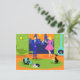 This Retro Romantic Evening Couple Postcard looks like a scene out of a 1960's romantic comedy. The minimalist design features an attractive cartoon couple in the living room of a mid century modern, urban apartment. The room prominently features a green, stone wall with a floor to ceiling window with a view. Through the window, we can see the blue silhouette of a big city skyline. A crescent moon is just visible in the orange sky of sunset. The furnishings in the room include a green, lounge chair with matching footstool, a yellow, sputnik light fixture, and a turquoise, cone shaped fireplace, complete with roaring fire. In the centre of the orange flooring, there is a round, green shag rug. A portable, turquoise and black record player is placed on the rug. Next to the record player, a vinyl record can be seen poking out of a kitschy album cover. Also on the rug, there is a sleek, black cat wearing a teal collar. This fancy feline is sitting in front of a martini glass. Enjoying this scene, we have a very sophisticated couple. There is a suave man wearing a blue suit, light blue shirt and red tie. The tall, dark and handsome man is enjoying the company of an elegant blonde woman. The lovely lady is wearing a hot pink dress with a form fitting bodice and flared skirt. They are each holding a crystal martini glass with a floating olive. Cheers! Here's to the perfect evening at home!