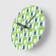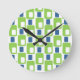 This clock is covered with retro rectangles of green and blue.