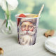 Paper cups with a vintage style illustration. A portrait of Santa with his big white beard wearing his classic traditional red Santa hat.