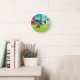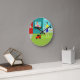 Welcome to Suburbia! This Retro Saturday Morning Acrylic Round Clock features an attractive minimalist cartoon couple in their little corner of paradise. From the window of a turquoise and teal brick house, we can see Mrs. Homemaker. The beautiful redhead is wearing a hot pink frock. She is holding a pitcher of freshly squeezed lemonade in one hand. On the windowsill in front of her, there is a piping hot, homemade, lattice topped, fruit pie in a green pie plate. On the walkway, in front of the red door to the home, the rolled up Saturday morning newspaper is waiting to be read. Mr. Man of the House is standing on the lush green lawn. He is wearing a blue shorts and a yellow shirt that matches his wife's sunny disposition. He is standing behind a red lawnmower. We can see that he has already mowed a strip of grass, but, at this point, it's difficult to tell if he is working hard or hardly working. The mowing seems to be at a standstill while he enjoys a tangy glass of lemonade. Ah, refreshing! Beside the house, the family feline is perched on a white picket fence. Snowball, the ironically named black cat, is looking down on her loyal subjects and the orange and yellow flowers that border the fence row. The yellow sun is peeking from behind fluffy, light blue clouds. The sky is the shade of aqua reserved for Hometown, USA in kitschy, mid century modern artwork. These make fun change of address cards or housewarming party invitations.