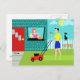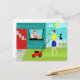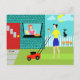 Welcome to Suburbia! This Retro Saturday Morning Postcard features an attractive minimalist cartoon couple in their little corner of paradise. From the window of a turquoise and teal brick house, we can see Mrs. Homemaker. The beautiful redhead is wearing a hot pink frock. She is holding a pitcher of freshly squeezed lemonade in one hand. On the windowsill in front of her, there is a piping hot, homemade, lattice topped, fruit pie in a green pie plate. On the walkway, in front of the red door to the home, the rolled up Saturday morning newspaper is waiting to be read. Mr. Man of the House is standing on the lush green lawn. He is wearing a blue shorts and a yellow shirt that matches his wife's sunny disposition. He is standing behind a red lawnmower. We can see that he has already mowed a strip of grass, but, at this point, it's difficult to tell if he is working hard or hardly working. The mowing seems to be at a standstill while he enjoys a tangy glass of lemonade. Ah, refreshing! Beside the house, the family feline is perched on a white picket fence. Snowball, the ironically named black cat, is looking down on her loyal subjects and the orange and yellow flowers that border the fence row. The yellow sun is peeking from behind fluffy, light blue clouds. The sky is the shade of aqua reserved for Hometown, USA in kitschy, mid century modern artwork. These make fun change of address cards or housewarming party invitations.
