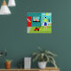 Welcome to Suburbia! This Retro Saturday Morning Poster features an attractive minimalist cartoon couple in their little corner of paradise. From the window of a turquoise and teal brick house, we can see Mrs. Homemaker. The beautiful redhead is wearing a hot pink frock. She is holding a pitcher of freshly squeezed lemonade in one hand. On the windowsill in front of her, there is a piping hot, homemade, lattice topped, fruit pie in a green pie plate. On the walkway, in front of the red door to the home, the rolled up Saturday morning newspaper is waiting to be read. Mr. Man of the House is standing on the lush green lawn. He is wearing a blue shorts and a yellow shirt that matches his wife's sunny disposition. He is standing behind a red lawnmower. We can see that he has already mowed a strip of grass, but, at this point, it's difficult to tell if he is working hard or hardly working. The mowing seems to be at a standstill while he enjoys a tangy glass of lemonade. Ah, refreshing! Beside the house, the family feline is perched on a white picket fence. Snowball, the ironically named black cat, is looking down on her loyal subjects and the orange and yellow flowers that border the fence row. The yellow sun is peeking from behind fluffy, light blue clouds. The sky is the shade of aqua reserved for Hometown, USA in kitschy, mid century modern artwork.
