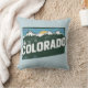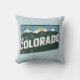 Stylish throw pillow features a retro scenic silhouette of Colorado State, with the Rockies and bold text on light blue background.