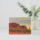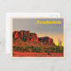 Brightly coloured vintage postcard design showing red cliffs mountains and saguaro cacti against a wild west sunset