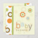 Customisable gender neutral baby shower invitation template with scrapbook style retro design featuring colourful circles pattern, flowers, patches and stitched letters on modern natural colours - green, orange, brown, cream. Suitable for new baby girl, baby boy or twins announcement.