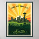A stylised, vintage-inspired illustration of the Seattle skyline featuring the Space Needle and city buildings against a sunset sky.