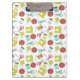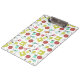 A clipboard featuring a sewing themed pattern with illustrations of a sewing machine, pin cushion, fabric swatches, scissors, needle, and spool of thread.