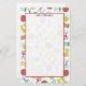 Stationery paper featuring a sewing themed design consisting of a sewing machine, spools of thread, a pin cushion, scissors, fabric swatches, and sewing needles. Design has a retro red, yellow, orange, blue, and turquoise colour scheme.
