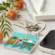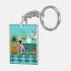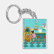 Serve up something special with this Retro Soda Fountain Acrylic Keychain. The minimalist art, cartoon drawing design features the interior of the coolest spot in town. It's a 1950's soda fountain, in all of its kitschy glory! Against the backdrop of an aqua wall, we can see posters advertising the specialities of the house. One poster shows a hamburger and bottle of pop for the bargain price of 15 cents. The other poster shows two scoops of ice cream in a sugar cone for a mere 5 cents. With prices like these, it must be difficult to watch your waistline! A most competent soda jerk is manning the teal counter with yellow accents. The young man with the strong work ethic is holding an ice cream cone with a single scoop of lemon yellow ice cream--although, to be fair, it could be pineapple! The clean-cut lad is wearing a pristine, white shirt with a black, bow tie and a white hat with red accents. On the opposite side of the counter, we see three red and chrome bar stools. Perched on one of the stools is a blonde teenybopper whose mouth is surely watering. It's unclear if her mouth is watering over the ice cream cone that is headed her way or the industrious young man who is serving it. She is wearing a pink poodle skirt and a form fitting black top. Her yellow locks are pulled back in a classic ponytail. Next to this cutie of a customer there is a colourful, classic jukebox, which features brown, wood grain, panelling and colourful neon lights. Better than that, it is sure to feature all of the greatest rock and roll hits of the time! The floor of this mid century modern ice cream parlour is an aqua and teal, chequerboard pattern that is just screaming for someone to try all of the latest dance moves.