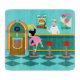 Serve up something special with this Retro Soda Fountain Cutting Board. The minimalist art, cartoon drawing design features the interior of the coolest spot in town. It's a 1950's soda fountain, in all of its kitschy glory! Against the backdrop of an aqua wall, we can see posters advertising the specialities of the house. One poster shows a hamburger and bottle of pop for the bargain price of 15 cents. The other poster shows two scoops of ice cream in a sugar cone for a mere 5 cents. With prices like these, it must be difficult to watch your waistline! A most competent soda jerk is manning the teal counter with yellow accents. The young man with the strong work ethic is holding an ice cream cone with a single scoop of lemon yellow ice cream--although, to be fair, it could be pineapple! The clean-cut lad is wearing a pristine, white shirt with a black, bow tie and a white hat with red accents. On the opposite side of the counter, we see three red and chrome bar stools. Perched on one of the stools is a blonde teenybopper whose mouth is surely watering. It's unclear if her mouth is watering over the ice cream cone that is headed her way or the industrious young man who is serving it. She is wearing a pink poodle skirt and a form fitting black top. Her yellow locks are pulled back in a classic ponytail. Next to this cutie of a customer there is a colourful, classic jukebox, which features brown, wood grain, panelling and colourful neon lights. Better than that, it is sure to feature all of the greatest rock and roll hits of the time! The floor of this mid century modern ice cream parlour is an aqua and teal, chequerboard pattern that is just screaming for someone to try all of the latest dance moves.