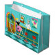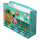 Serve up something special with this Retro Soda Fountain Gift Bag. The minimalist art, cartoon drawing design features the interior of the coolest spot in town. It's a 1950's soda fountain, in all of its kitschy glory! Against the backdrop of an aqua wall, we can see posters advertising the specialities of the house. One poster shows a hamburger and bottle of pop for the bargain price of 15 cents. The other poster shows two scoops of ice cream in a sugar cone for a mere 5 cents. With prices like these, it must be difficult to watch your waistline! A most competent soda jerk is manning the teal counter with yellow accents. The young man with the strong work ethic is holding an ice cream cone with a single scoop of lemon yellow ice cream--although, to be fair, it could be pineapple! The clean-cut lad is wearing a pristine, white shirt with a black, bow tie and a white hat with red accents. On the opposite side of the counter, we see three red and chrome bar stools. Perched on one of the stools is a blonde teenybopper whose mouth is surely watering. It's unclear if her mouth is watering over the ice cream cone that is headed her way or the industrious young man who is serving it. She is wearing a pink poodle skirt and a form fitting black top. Her yellow locks are pulled back in a classic ponytail. Next to this cutie of a customer there is a colourful, classic jukebox, which features brown, wood grain, panelling and colourful neon lights. Better than that, it is sure to feature all of the greatest rock and roll hits of the time! The floor of this mid century modern ice cream parlour is an aqua and teal, chequerboard pattern that is just screaming for someone to try all of the latest dance moves.