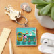 Serve up something special with this Retro Soda Fountain Keychain. The minimalist art, cartoon drawing design features the interior of the coolest spot in town. It's a 1950's soda fountain, in all of its kitschy glory! Against the backdrop of an aqua wall, we can see posters advertising the specialities of the house. One poster shows a hamburger and bottle of pop for the bargain price of 15 cents. The other poster shows two scoops of ice cream in a sugar cone for a mere 5 cents. With prices like these, it must be difficult to watch your waistline! A most competent soda jerk is manning the teal counter with yellow accents. The young man with the strong work ethic is holding an ice cream cone with a single scoop of lemon yellow ice cream--although, to be fair, it could be pineapple! The clean-cut lad is wearing a pristine, white shirt with a black, bow tie and a white hat with red accents. On the opposite side of the counter, we see three red and chrome bar stools. Perched on one of the stools is a blonde teenybopper whose mouth is surely watering. It's unclear if her mouth is watering over the ice cream cone that is headed her way or the industrious young man who is serving it. She is wearing a pink poodle skirt and a form fitting black top. Her yellow locks are pulled back in a classic ponytail. Next to this cutie of a customer there is a colourful, classic jukebox, which features brown, wood grain, panelling and colourful neon lights. Better than that, it is sure to feature all of the greatest rock and roll hits of the time! The floor of this mid century modern ice cream parlour is an aqua and teal, chequerboard pattern that is just screaming for someone to try all of the latest dance moves.