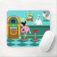 Serve up something special with this Retro Soda Fountain Mousepad. The minimalist art, cartoon drawing design features the interior of the coolest spot in town. It's a 1950's soda fountain, in all of its kitschy glory! Against the backdrop of an aqua wall, we can see posters advertising the specialities of the house. One poster shows a hamburger and bottle of pop for the bargain price of 15 cents. The other poster shows two scoops of ice cream in a sugar cone for a mere 5 cents. With prices like these, it must be difficult to watch your waistline! A most competent soda jerk is manning the teal counter with yellow accents. The young man with the strong work ethic is holding an ice cream cone with a single scoop of lemon yellow ice cream--although, to be fair, it could be pineapple! The clean-cut lad is wearing a pristine, white shirt with a black, bow tie and a white hat with red accents. On the opposite side of the counter, we see three red and chrome bar stools. Perched on one of the stools is a blonde teenybopper whose mouth is surely watering. It's unclear if her mouth is watering over the ice cream cone that is headed her way or the industrious young man who is serving it. She is wearing a pink poodle skirt and a form fitting black top. Her yellow locks are pulled back in a classic ponytail. Next to this cutie of a customer there is a colourful, classic jukebox, which features brown, wood grain, panelling and colourful neon lights. Better than that, it is sure to feature all of the greatest rock and roll hits of the time! The floor of this mid century modern ice cream parlour is an aqua and teal, chequerboard pattern that is just screaming for someone to try all of the latest dance moves.