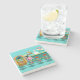 Serve up something special with this Retro Soda Fountain Stone Coaster. The minimalist art, cartoon drawing design features the interior of the coolest spot in town. It's a 1950's soda fountain, in all of its kitschy glory! Against the backdrop of an aqua wall, we can see posters advertising the specialities of the house. One poster shows a hamburger and bottle of pop for the bargain price of 15 cents. The other poster shows two scoops of ice cream in a sugar cone for a mere 5 cents. With prices like these, it must be difficult to watch your waistline! A most competent soda jerk is manning the teal counter with yellow accents. The young man with the strong work ethic is holding an ice cream cone with a single scoop of lemon yellow ice cream--although, to be fair, it could be pineapple! The clean-cut lad is wearing a pristine, white shirt with a black, bow tie and a white hat with red accents. On the opposite side of the counter, we see three red and chrome bar stools. Perched on one of the stools is a blonde teenybopper whose mouth is surely watering. It's unclear if her mouth is watering over the ice cream cone that is headed her way or the industrious young man who is serving it. She is wearing a pink poodle skirt and a form fitting black top. Her yellow locks are pulled back in a classic ponytail. Next to this cutie of a customer there is a colourful, classic jukebox, which features brown, wood grain, panelling and colourful neon lights. Better than that, it is sure to feature all of the greatest rock and roll hits of the time! The floor of this mid century modern ice cream parlour is an aqua and teal, chequerboard pattern that is just screaming for someone to try all of the latest dance moves.