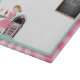 A cute cutting board with a retro soda shop theme with girl in poodle skirt, jukebox and menu board with pink sun ray border and musical notes.