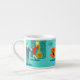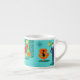 Honey, I'm home! This Retro Space Age Cartoon Couple Espresso Mug will have you feeling envious of the cartoon couple on an espresso mug! The design features a turquoise background with teal bricks and an olive green, cone fireplace. A sleek, black cat is sitting on a sleek orange chair. There is a teal, starburst wall clock and a two-tier pendant lamp in shades of yellow, blue and black. Front and centre, there is a distinguished, martini-swilling businessman in a blue suit and orange tie. To his side, his blonde bombshell of a trophy wife is wearing a red wiggle dress and holding a tray of martinis. Va-va-va-voom!