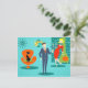 Honey, I'm home! This Retro Space Age Cartoon Couple Postcard will have you feeling envious of the cartoon couple on a greeting card! The design features a turquoise background with teal bricks and an olive green, cone fireplace. A sleek, black cat is sitting on a sleek orange chair. There is a teal, starburst wall clock and a two-tier pendant lamp in shades of yellow, blue and black. Front and centre, there is a distinguished, martini-swilling businessman in a blue suit and orange tie. To his side, his blonde bombshell of a trophy wife is wearing a red wiggle dress and holding a tray of martinis. Va-va-va-voom!