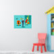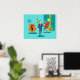 Honey, I'm home! This Retro Space Age Cartoon Couple Poster will have you feeling envious of the cartoon couple on a stretched canvas print! The design features a turquoise background with teal bricks and an olive green, cone fireplace. A sleek, black cat is sitting on a sleek orange chair. There is a teal, starburst wall clock and a two-tier pendant lamp in shades of yellow, blue and black. Front and centre, there is a distinguished, martini-swilling businessman in a blue suit and orange tie. To his side, his blonde bombshell of a trophy wife is wearing a red wiggle dress and holding a tray of martinis. Va-va-va-voom!