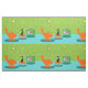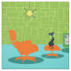It is said that dogs have owners and cats have staff. The feline on this Retro Space Age Kitty Fabric couldn't agree more! The 1960's style, minimalist art design features a sleek, black cat in a mid century modern living room. The sophisticated room prominently features a green, stone wall. The carpet is aqua with teal shadows. The furnishings of the room include a yellow, sputnik light figure, an orange lounge chair with matching footstool and a green television with rabbit ears. The lucky black cat can be seen perched on the footstool in front of the television. Its favourite show is on! On the television screen, we can see a black and white, classic television family solving all of life's problems in a half hour show. This design is purrrfect, if we do say so ourselves.