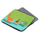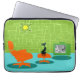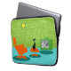It is said that dogs have owners and cats have staff. The feline on this Retro Space Age Kitty Laptop Sleeve couldn't agree more! The 1960's style, minimalist art design features a sleek, black cat in a mid century modern living room. The sophisticated room prominently features a green, stone wall. The carpet is aqua with teal shadows. The furnishings of the room include a yellow, sputnik light figure, an orange lounge chair with matching footstool and a green television with rabbit ears. The lucky black cat can be seen perched on the footstool in front of the television. Its favourite show is on! On the television screen, we can see a black and white, classic television family solving all of life's problems in a half hour show. This design is purrrfect, if we do say so ourselves.