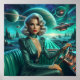 Retro woman driving through the cosmos looking for intelligent life. The vivid colors, bold energy, and vintage theme pay tribute to the thrilling imagination of midcentury book covers and movie posters.