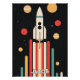 A vibrant retro-themed illustration of a classic rocket ship blasting off into space, surrounded by colourful planets, stars, and cosmic elements. the design uses bold reds, teals, and oranges against a dark starry background, evoking mid-century sci-fi aesthetics. This whimsical and nostalgic artwork is ideal for children’s rooms. The best part of this poster is that you can customise it with your kid's name.