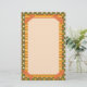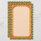 Bright orange striped faux washi tape adorns the corners of this colorful multi pattern design with hand drawn floral and striped patterns in orange, yellow, cream and green, bordering a spacious cream writing paper.