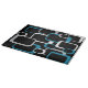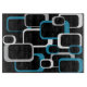 A cool 1960s inspired pattern done in grey, white and turquoise blue squares on a black background