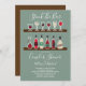 Retro Stock the Bar Couples Shower Invitation featuring a shelf with liqueur bottles & bar glasses set on a green background with a coordination brown back for a special touch.