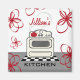 A magnet featuring an illustration of a retro stove in white sitting on a black and white floor. Red pot on front left burner of stove. Bottom portion is grey, with red flowers all around. Look for matching recipe binder, recipe cards, and more at Jill's Paperie.