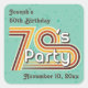 70's Party Stickers featuring a retro style typography of '70's Party''. Designs include seventies inspired elements of blue, orange, mustard yellow, dark red and brown, stripes, and vintage texture. Includes a template to personally customise with event and date.