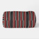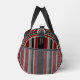 Retro stripes on this classic, dark design. Vertical red, blue, and beige stripes adorn the entire duffel bag, including the sides. There's a vertical area on one side for your name or text.