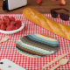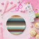 This design features horizontal stripes in various vintage colours, such as brown, orange, beige, blue, black, grey and white. It really conjures up the style of the mid 20th century.