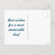 A navy blue background... with red, orange, yellow and light blue stripes... inspired by vintage styles... Back reads... "Best wishes for a most memorable day!"...