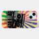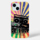 Retro look design featuring a 80's look boom box stereo and two cassette tapes on a red blue pink and green sunburst background.