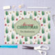 This Christmas tissue paper features a pattern with a retro style look consisting of tall skinny Christmas trees, gifts and gold swirls in muted greens, dark red and gold on a white background. In the centre, is a light olive green oval with text that reads: Merry Christmas. Customisable text, also in the oval, allows you to personalise with your name.