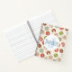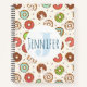 Personalised notebook with a cute pattern featuring doughnuts tumbling all around. Pink, green, brown and cream colours really give this design a cool retro feel. A circle layered over top with your name and monogram initial inside.