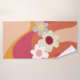 Abstract colourful retro style design with blooming flowers and yellow, orange and pink waves decoration on pastel pink background