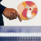 Abstract colourful retro style design with blooming flowers and yellow, orange and pink waves decoration on pastel pink background
