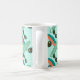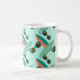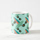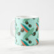 The pattern decorating this mug is inspired by summertime at the beach. It features retro style sunglasses and surfboards in cool colours of teal and green with orange.