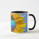 Close up of a yellow sunflower wearing retro sunglasses with a summer sky background.