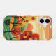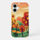 A warm retro orchard illustration with glowing fruit trees beneath a soft sunset sky.
