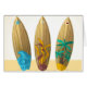 A design of three retro wooden surfboards standing together on the sand. The surfboard designs include blue waves, dolphins and palm trees. This design is cool, hip and perfect for lovers of the beach, Summer and surf lifestyle.